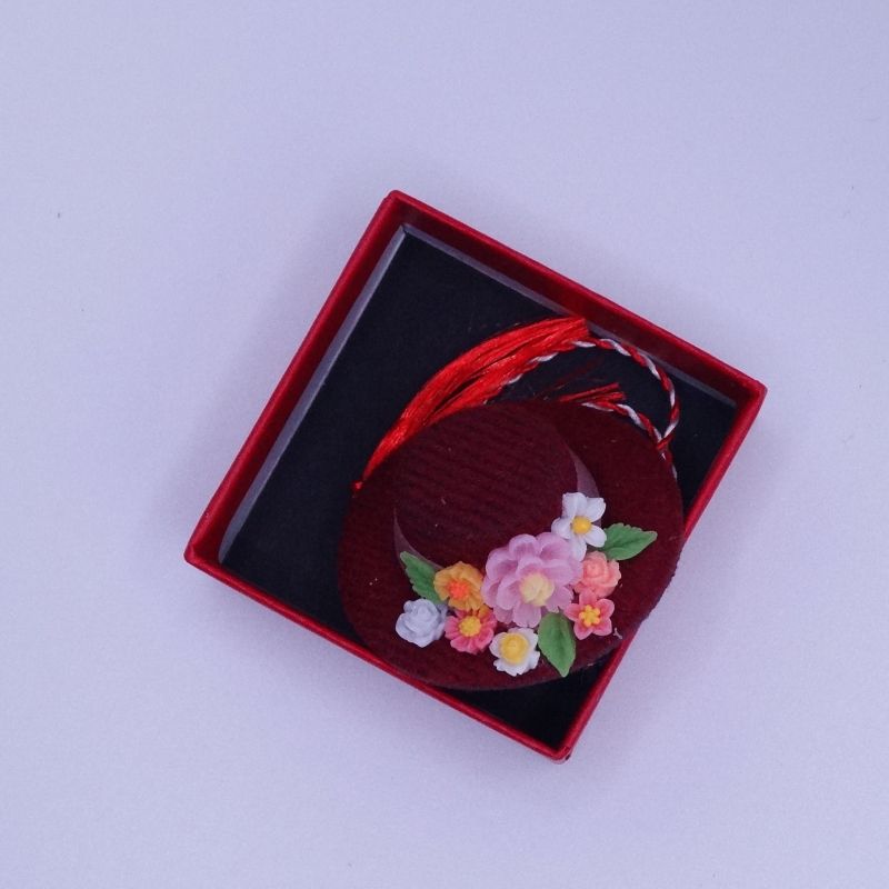 Pălărie elegantă din fetru cu flori alese cu grijă. O broșă delicată lucrată manual.